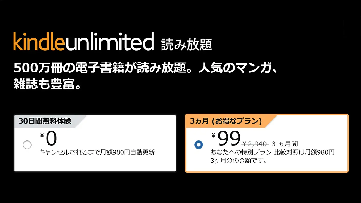 Amazonの電子書籍読み放題サービス「Kindle Unlimited」において、3ヶ月99円で利用可能となるキャンペーンが開催されています。