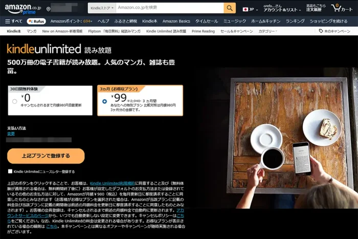 Kindle Unlimited 3ヶ月間99円で利用可能