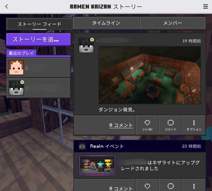 Realmsでしか使えない限定機能として、ストーリがあります。これは、Realms内の参加者が新しいバイオームを発見した時などに記録したり、コメントと共にスクリーンショットを張り付けられる、いわば掲示板のような機能です。