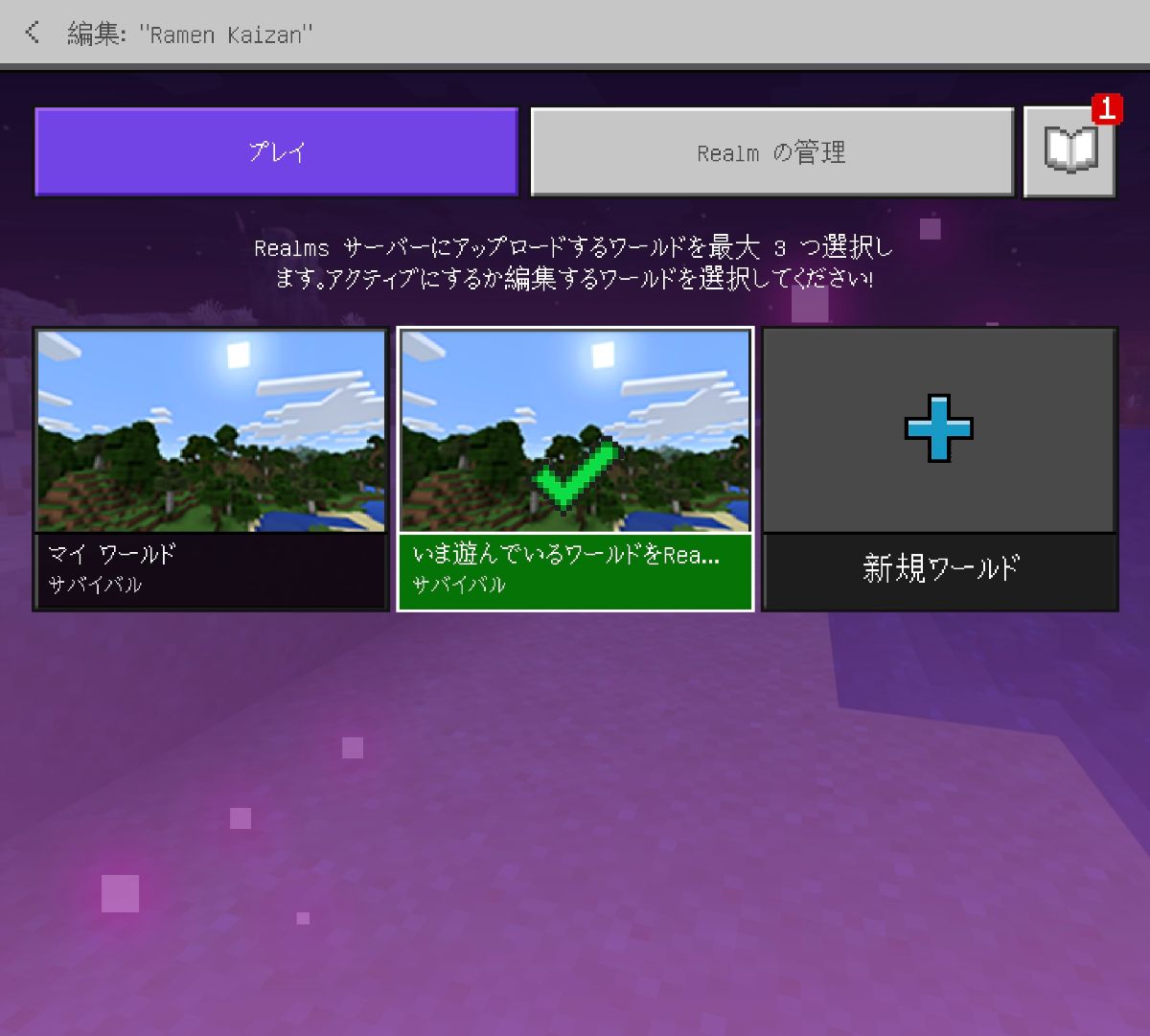 Realmsでは、ワールド新規作成に加え、今遊んでいるワールドを誰でも簡単に24時間稼働するサーバーにできます。筆者がjava版を遊んでいた当初はワールドデータが格納されたファイルをサーバー側に転送して……みたいな、面倒な手順を踏む必要がありました。Realmsの場合はワンタップで完了するため快適です。ワールドは最大3つまでアップロードできます。