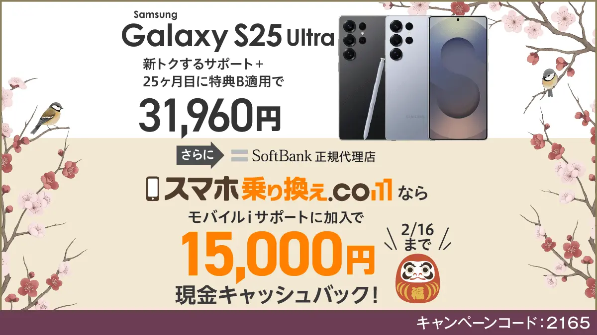 スマホ乗り換え.comでGalaxy S25 / S25 Ultra / Z Flip7を購入し、MNPまたは新規(5〜18歳)で対象プランに加入、モバイルiサポに1ヶ月加入すると15,000円の現金キャッシュバックがもらえます。