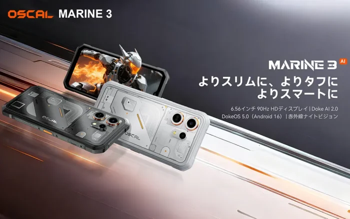 OSCAL MARINE3は軽量タフネスを謳うAndroid 16搭載スマートフォンです。IP68/IP69K防水防塵+MIL-STD-810H耐衝撃に対応し、厚さ10.7mmで重量約245gです。一般的なスマートフォンと比べると厚く重いですが、タフネススマホなら…。