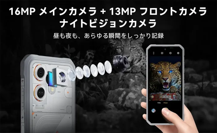 背面カメラは16MPのメインカメラのほか、13MPのナイトビジョンカメラを搭載します。これにより暗闇の中でも撮影可能です。また、IP68/IP69K防水防塵を活かした水中カメラモードも搭載します。アウトドアで活躍できるカメラですね。