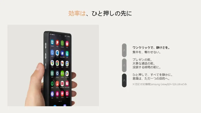 - 専用アプリ「Aaron Button」による統合管理: 近日公開予定の専用アプリで、3つのボタンへの機能割り当てから設定変更まで一元管理。操作ガイドやプリセットも用意し、初心者でも簡単。Galaxy S25 Ultra及びGalaxy S24 Ultra向けPinButtonケースでも使用可能