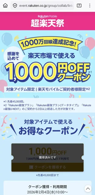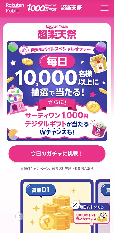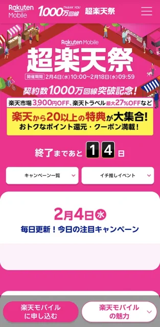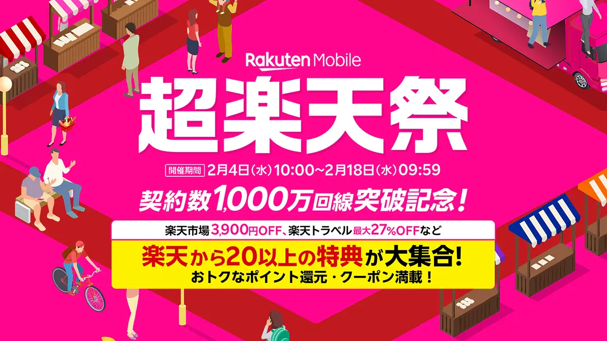 楽天モバイルは2月4日より、契約数1000万回線突破を記念した「超楽天祭」を開始しました。楽天モバイルの契約者が対象で、楽天市場で使えるクーポンや1日1回挑戦できる週替りの抽選など特典盛りだくさんです。