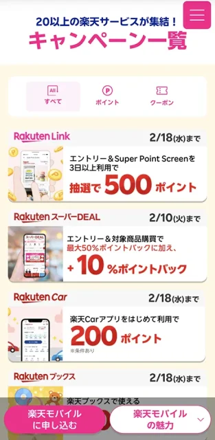 楽天市場で使えるクーポンや毎日挑戦できる抽選もあるので、楽天モバイルユーザーは一度はチェックしておくといいでしょう。