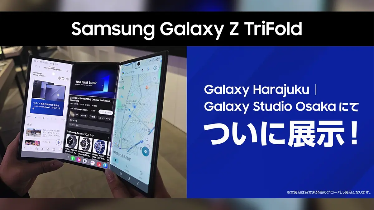 サムスンは2月12日より、日本未発売の三つ折りスマートフォン「Samsung Galaxy Z TriFold」をGalaxy HarajukuとGalaxy Studio Osakaにて展示開始しました。