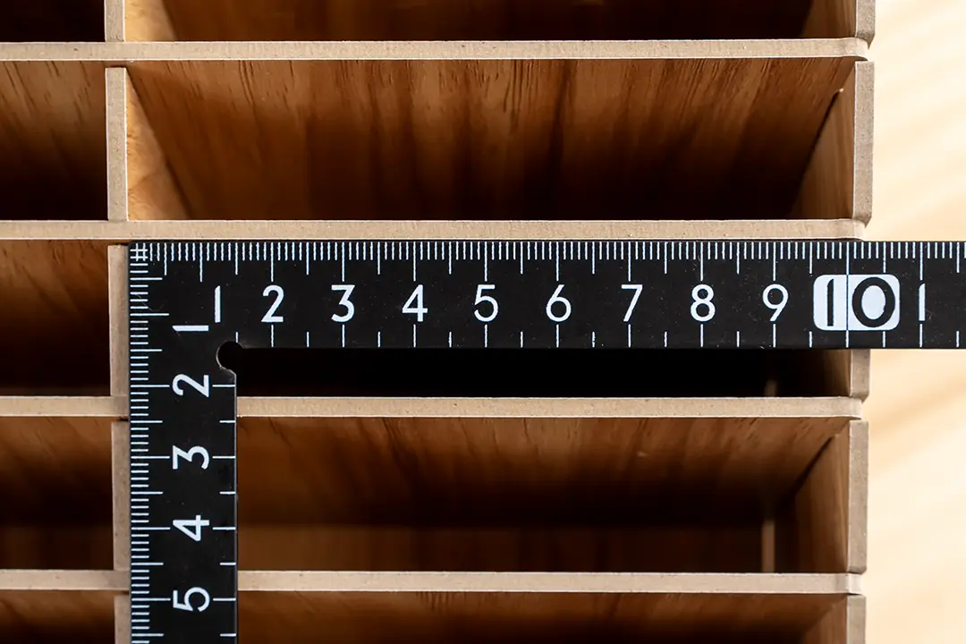 以前購入した14台収納のものと並べてみました。7段と8段の違いもありますし、奥行きが違うのでピッタリとは並びません。色合い的には似たようなものなので、前面の一を合わせれば並べても違和感ありませんね。