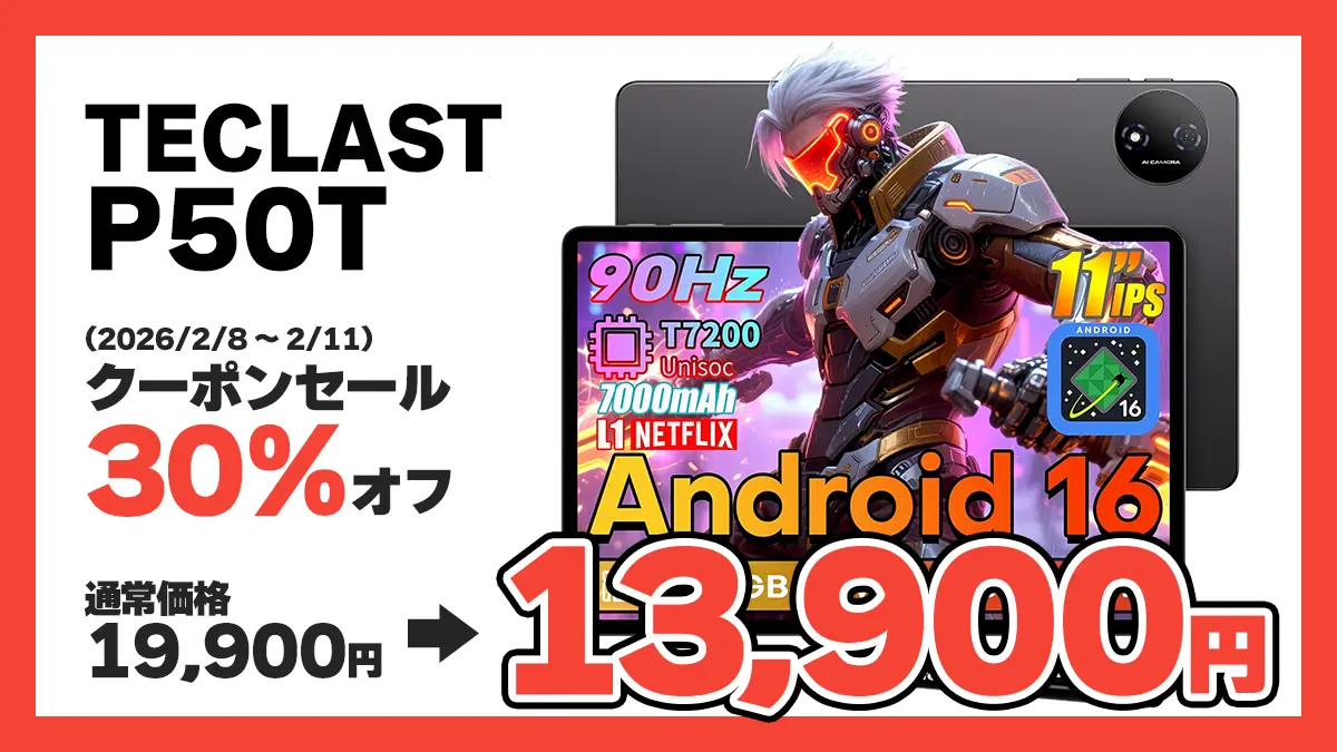 TECLASTの11インチAndroidタブレット「TECLAST P50T」が期間限定セールとしてクーポンでセール価格13,900円となっています。