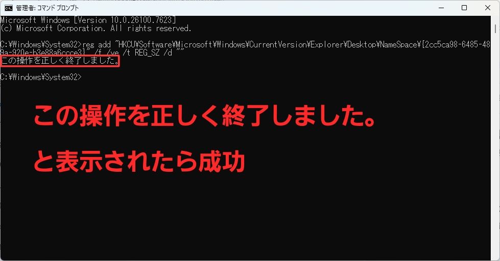 アイコンを再表示させたい場合は、削除したときと同様にコマンドプロンプトで下記のコマンドを入力してください。