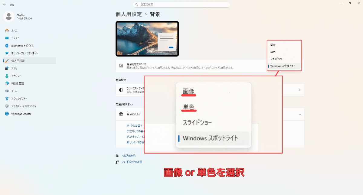 「特にスポットライト機能にこだわりがない」という人は、壁紙設定を変更し、「Windows スポットライト」を使わないのが一番安全で簡単です 。