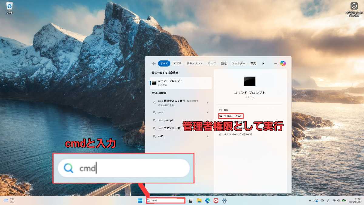 コマンドプロンプトを管理者権限で実行してください。デスクトップ下部にある検索ボックスに「cmd」と入力し、表示されたメニューから「管理者として実行」をクリックします。