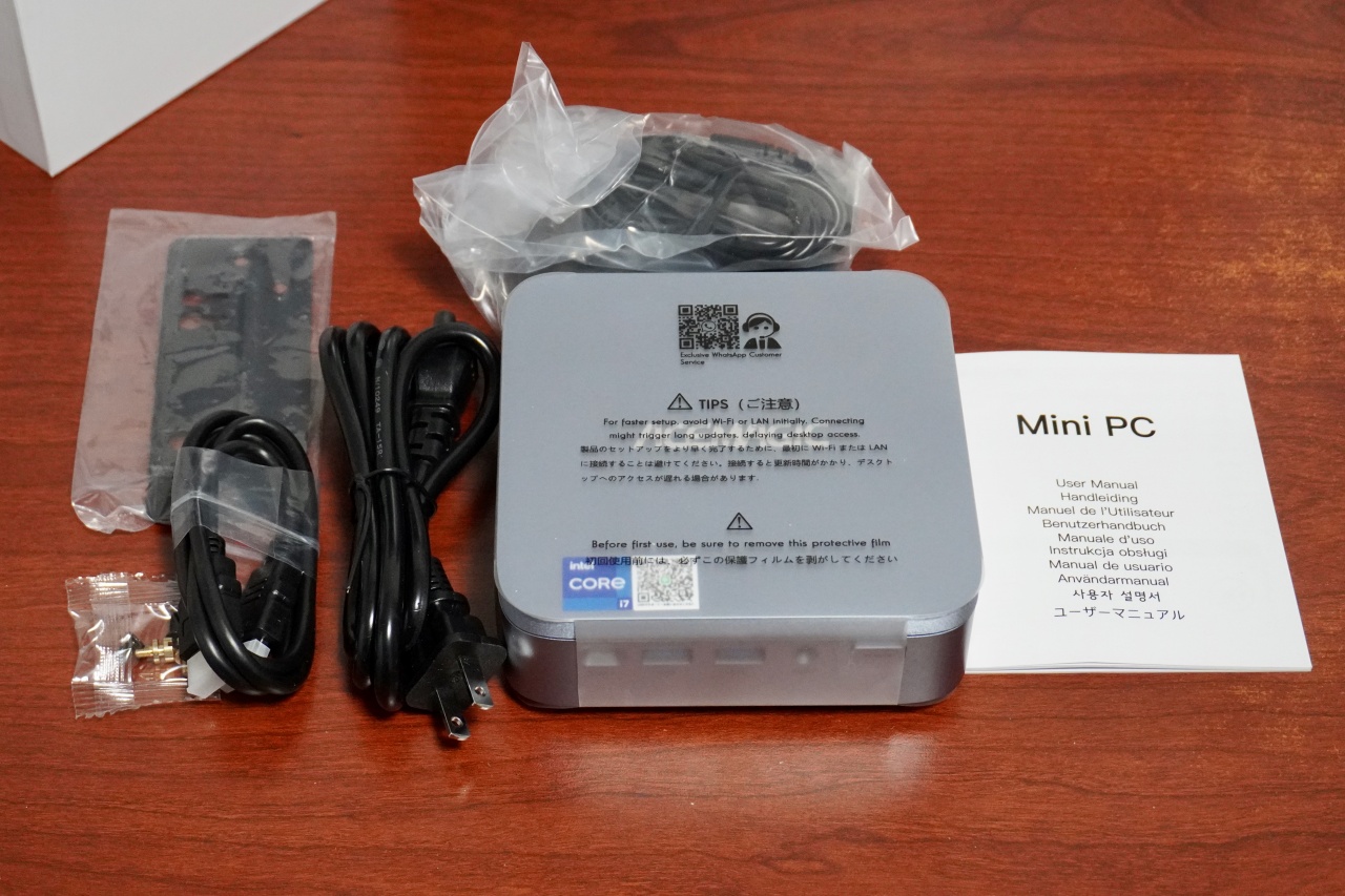 内容物は、ACEMAGIC M5本体、電源ユニットとケーブル、HDMIケーブル、VESAマウント用の器具、説明書類となっています。