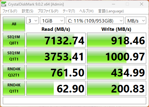 ちなみに、SSDはPCIe 4.0×4に対応したものが搭載されており、CrystalDiskMarkの結果はかなり高速でした。