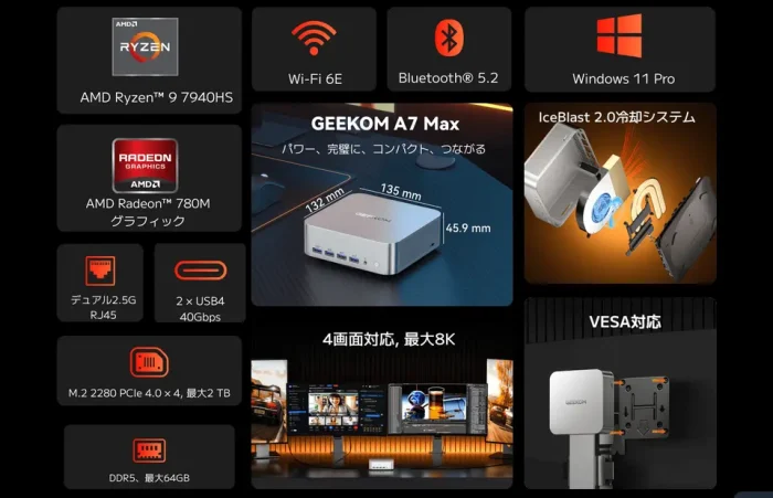 GEEKOM A7 MAXはAMD Ryzen 9 7940HSを搭載したハイスペックなミニPCです。RAMはDDR5 5600 16GBでストレージは1TBです。コンパクトサイズながら必要十分以上の性能を持ち、オフィスワークはもちろん、軽めのゲームも快適に動作します。(さすがに本格的な3Dゲームは向いてません)