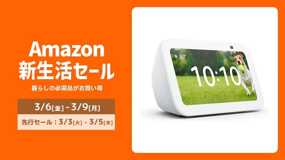 3月3日0時から先行セールが始まるAmazonの新生活セールにおいて、一部Amazonデバイスのセール価格が事前に公開されています。今回はEcho Show 5が4,500円、Echo Hubが7,980円と最近の中ではなかなか安くなっており狙い目です。