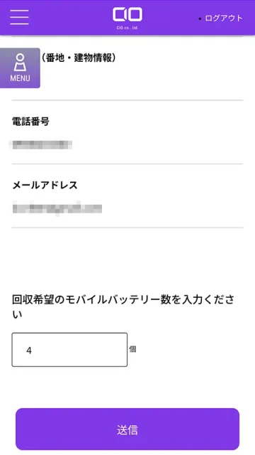 CIO公式サイトの他社製MB回収サービスから、まずは仮申請を行います。CIOの会員登録の住所等がそのまま入力され、回収するモバイルバッテリーの数量を入力します。