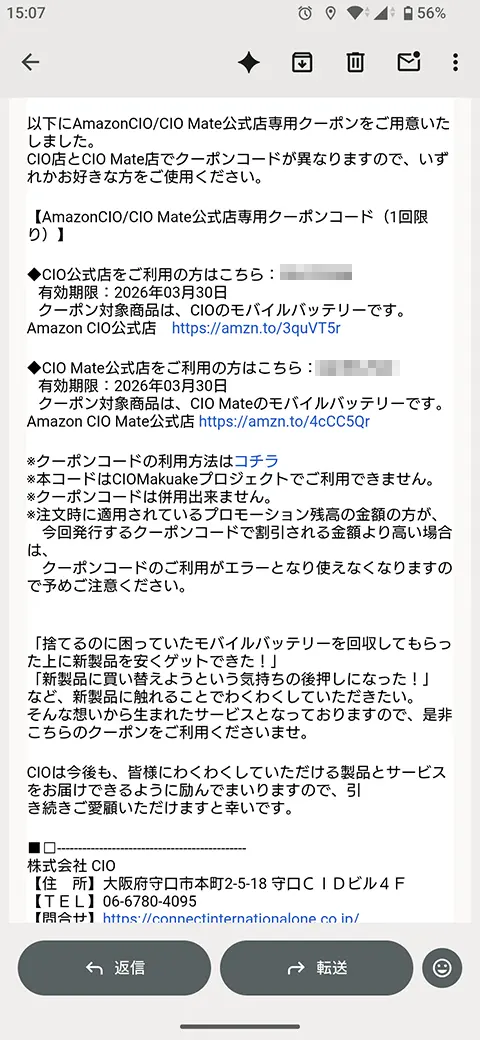 本申請が完了すると、完了メールとともにAmazonで使えるクーポンが送られてきます。これはCIO/CIO Mateのモバイルバッテリーが対象で、1個の場合は10%オフ、2個の場合は13%オフ、3個以上の場合は15%オフになります。