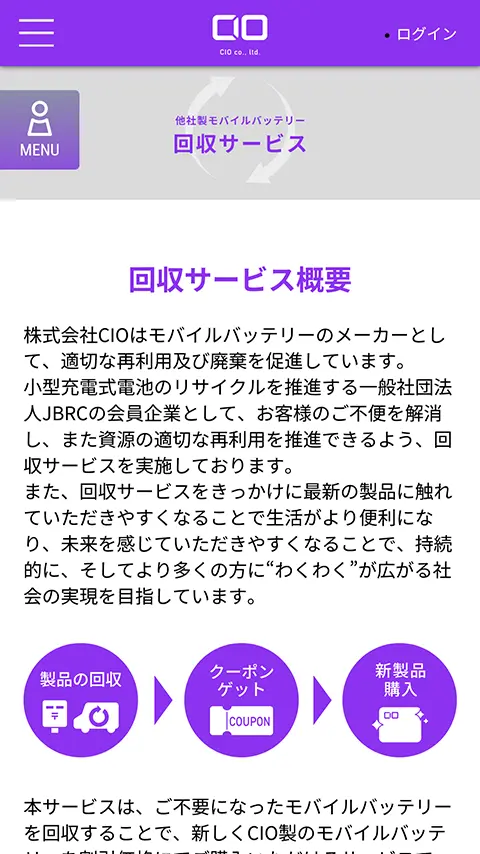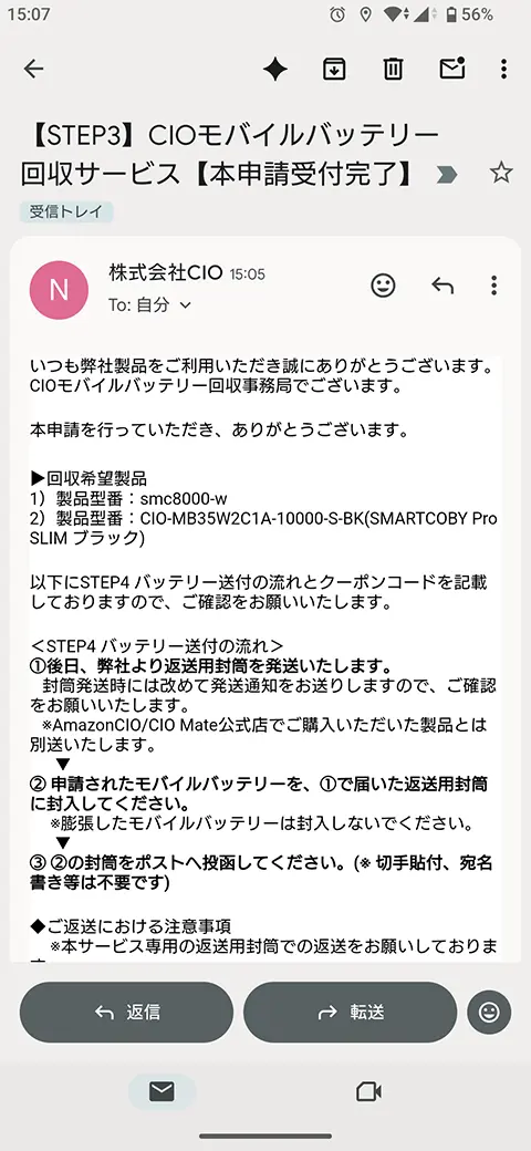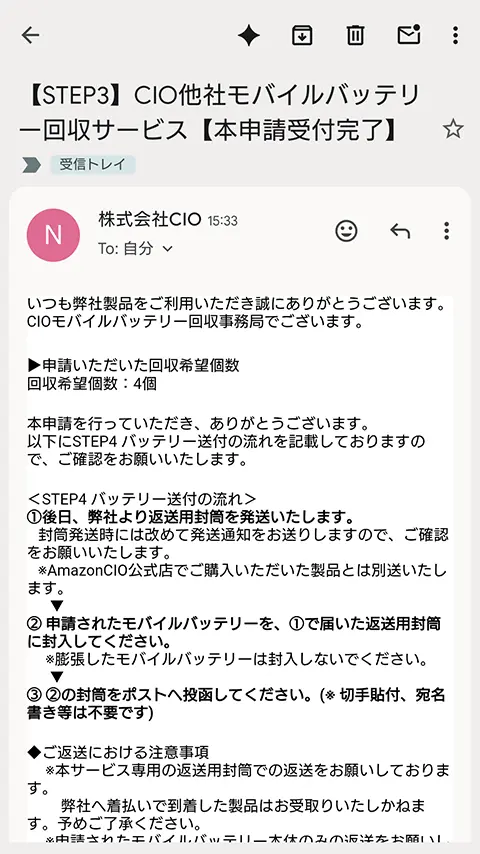 CIO製以外のモバイルバッテリーを回収してもらう手順は以下の通り。