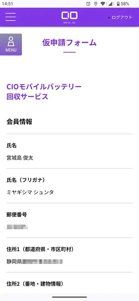 CIO公式サイトの他社製MB回収サービスから、まずは仮申請を行います。CIOの会員登録の住所等がそのまま入力され、回収するモバイルバッテリーの数量を入力します。