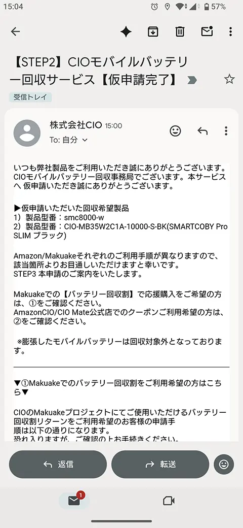 仮申請の完了メールにAmazonでCIO/CIO Mateの製品に使えるクーポンが記載されています。このクーポンを使ってCIO/CIO Mateのモバイルバッテリーを新たに購入しないと本申請できません。