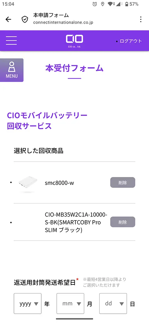 CIO製のモバイルバッテリーを回収してもらう手順は以下の通り。