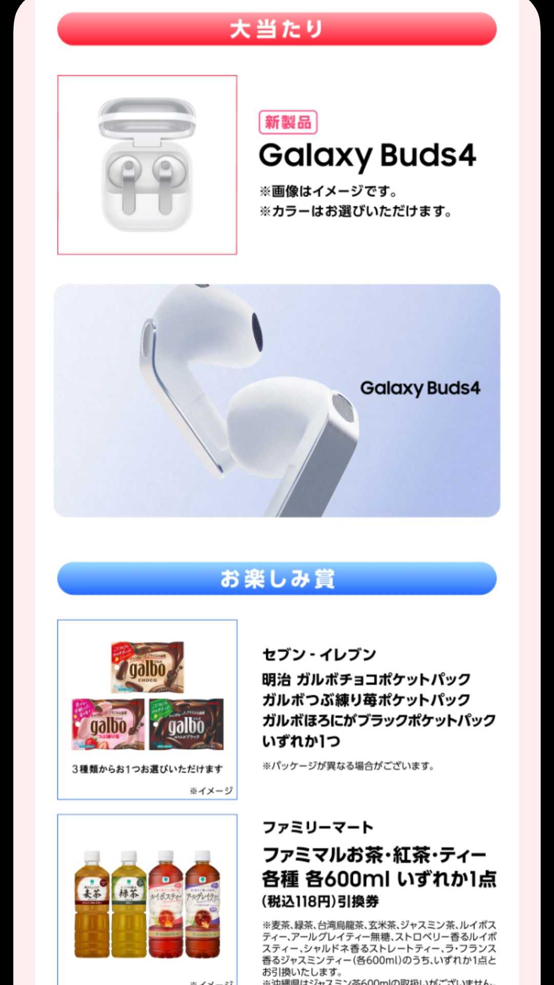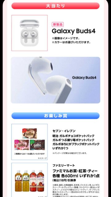 3月のGalaxyスクラッチの特賞はGalaxy Buds4 Pro、大当たりはGalaxy Buds4、お楽しみ賞はコンビニで引き換えられるプチギフトです。