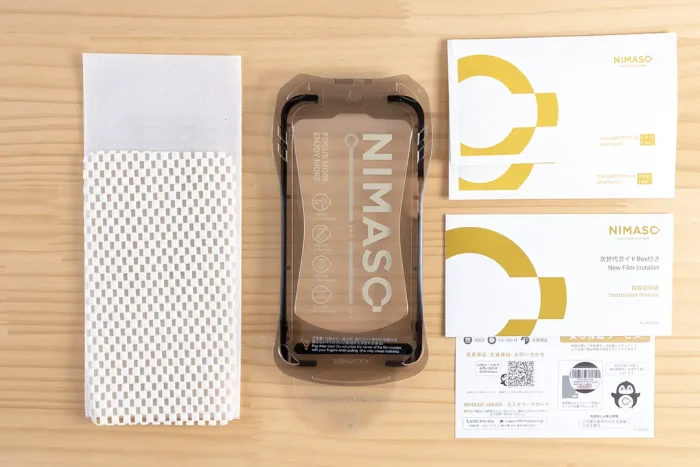 中身はガラスフィルム本体×2、貼り付け用ガイドボックス、クリーニングセット×2、滑り止めマット、説明書類です。この貼り付けガイドボックスを試してみたいというのもあってこれを選びました。