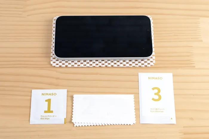 クリーニングセットはアルコールパッドとファイバークロス、ホコリ取りシートの3点です。滑り止めマットの上で作業できるのがいいですね。