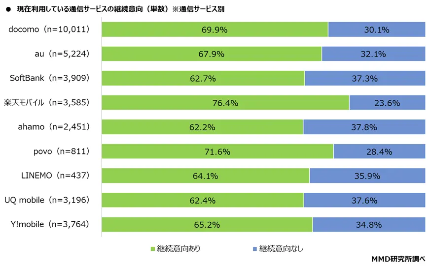 通信サービス別に見ると、最も継続意向が高いのは楽天モバイルで76.4%、最も継続意向が低いのはahamoで62.2%でした。