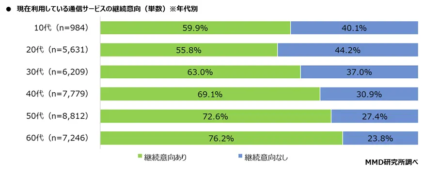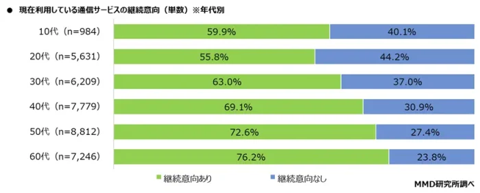 年代別に見ると、最も継続意向が高いのは60代で76.2%、最も継続意向が低いのは20代で55.8%でした。10代を除いて年齢とともに継続意向は高くなっています。