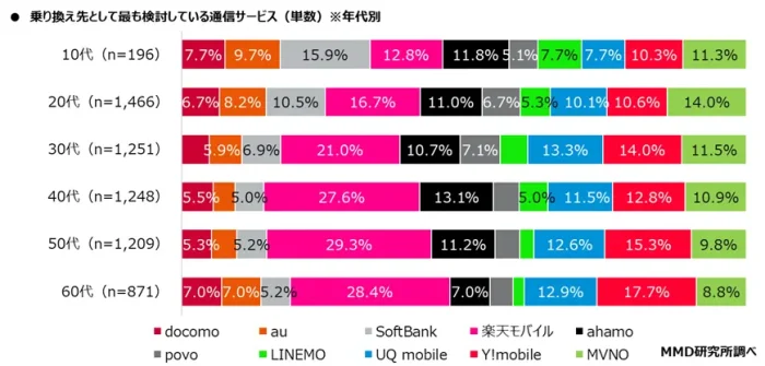 年代別に見ると10代はソフトバンク、それ以外の年代は楽天モバイルがトップでした。