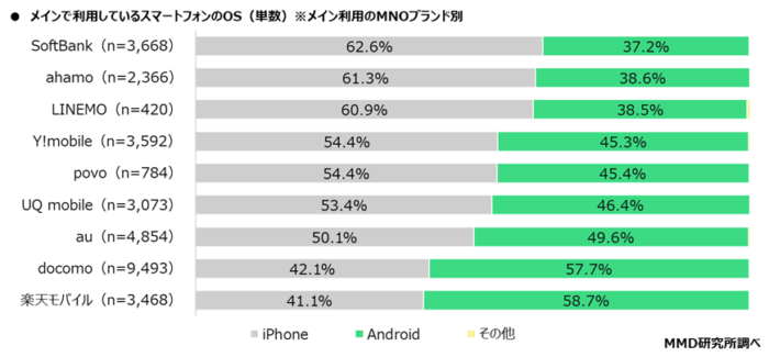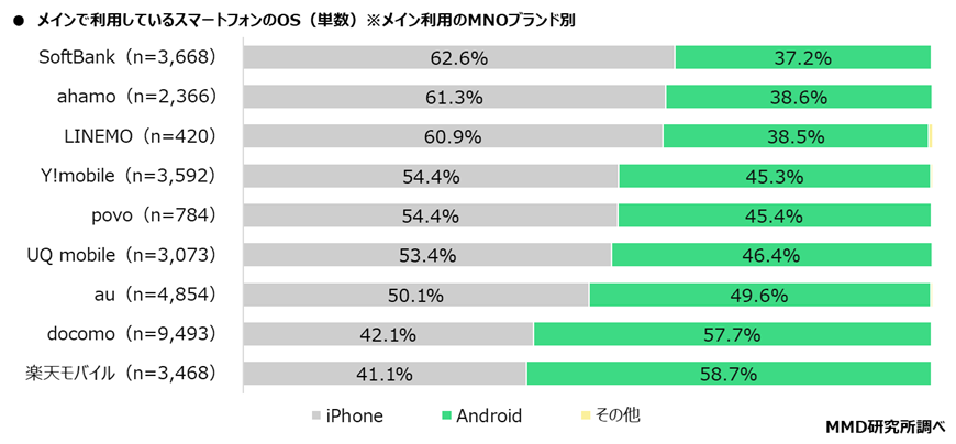 メイン利用しているMNOブランド別で見ると、ソフトバンク、ahamo、LINEMOではiPhoneが60%を超え、逆にAndroidが50%を超えているのは楽天モバイルとdocomoのみです。