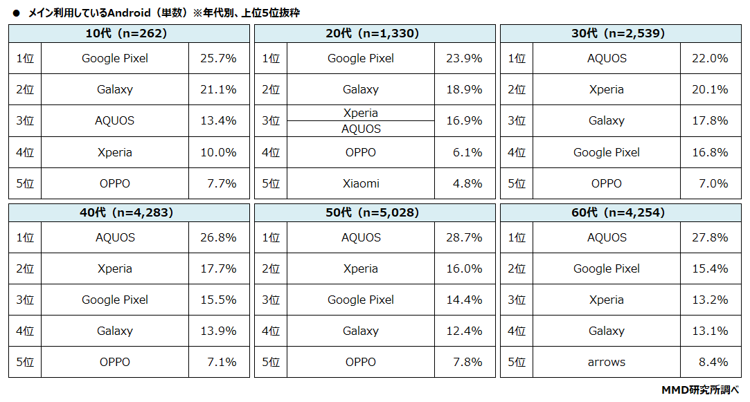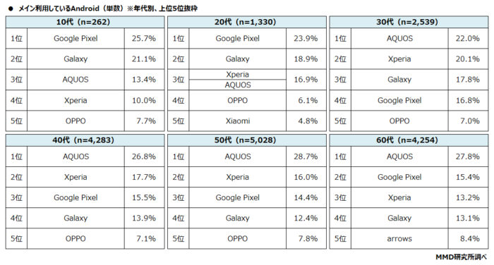 年代別に見ると10代と20代ではGoogle Pixelが、30代、40代、50代、60代ではAQUOSがそれぞれトップになっています。