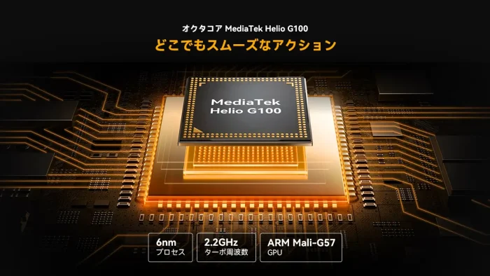 SoCにはMediaTek Helio G100プロセッサを搭載し、RAMは12GB(+36GB拡張)、ストレージは256GBを搭載しています。このほか、4.5Wのスピーカーや93ルーメンのLEDライト、家電操作が可能な赤外線リモコン機能も備えています。