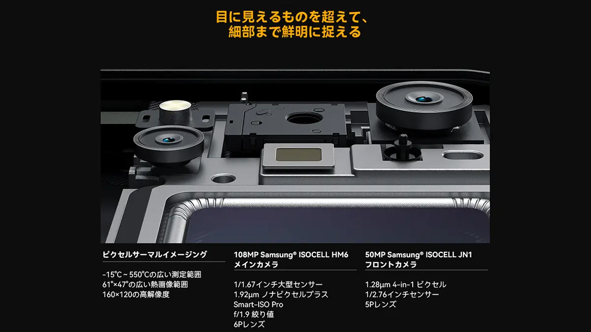 カメラ性能については、108MPのSamsung ISOCELL HM6メインカメラを採用し 、フロントには50MPのSamsung ISOCELL JN1カメラを搭載しています。これにより、屋外での点検業務から日常の撮影まで、精細な画像記録が可能です 。