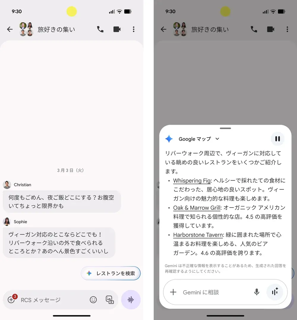 メッセージのチャット画面の中でGeminiの提案を開くことができます。夕食のお店選びの会話の中でボタンをタップすると、会話の内容を汲んだおすすめのレストランを表示します。アプリを切り替える必要がないため、友人との会話を止めることなく、その場でスマートに計画を立てられます。