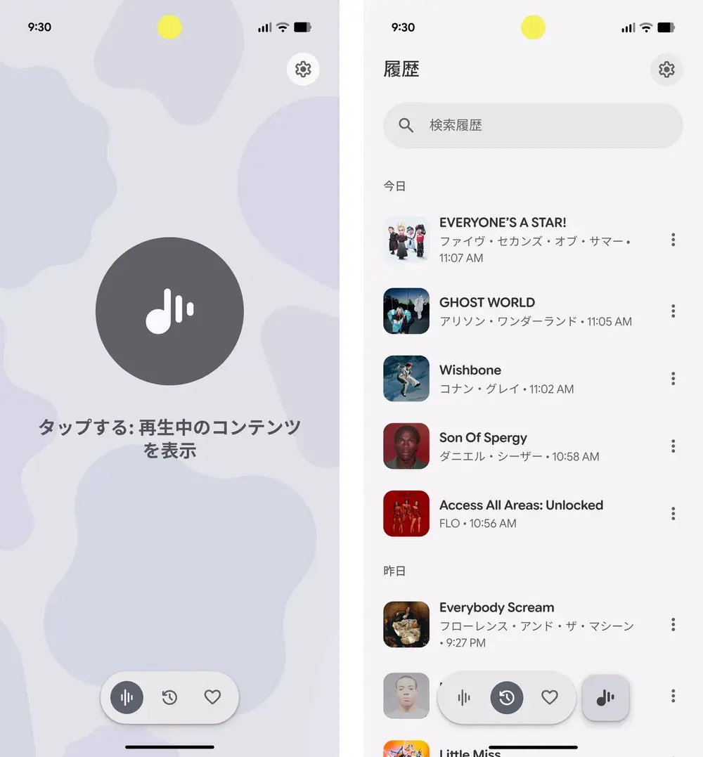 周囲で流れている曲を特定する「この曲なに?」が、独立したアプリになりました。システム設定内ではなくアプリで管理でき、履歴タブから過去に流れた曲を一覧で確認したり、そのままお好みの音楽アプリで再生することも可能です。