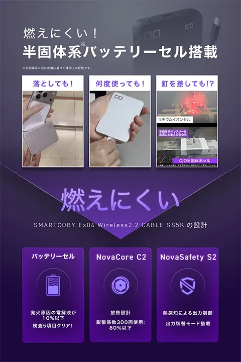本製品は発火原因となる電解液を抑えた半固体系バッテリーセルを採用しています。さらに独自の放熱設計と出力制御によって安全性に配慮した設計となっています。