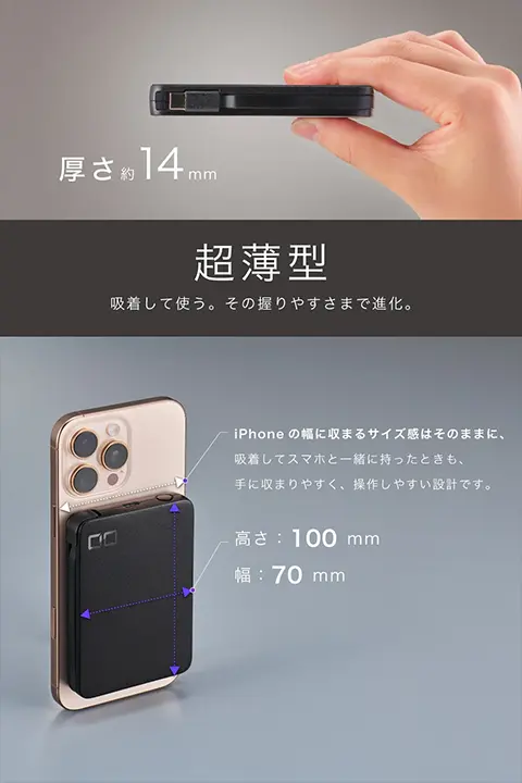バッテリー容量は5000mAhで本体サイズは約100×70×14mm、重量は約151gとかなり薄型です。