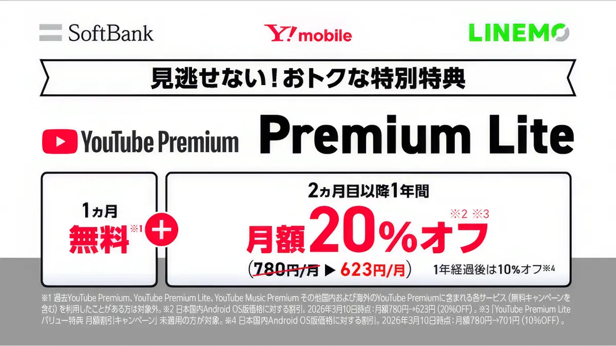 - 「YouTube Premium™ Lite」をおトクに利用できる特典を提供開始~“ソフトバンク” “ワイモバイル” “LINEMO”のお客さまは初月無料、2カ月目以降は月額料金が1年間最大20%オフで利用可能~ | 企業・IR | ソフトバンク