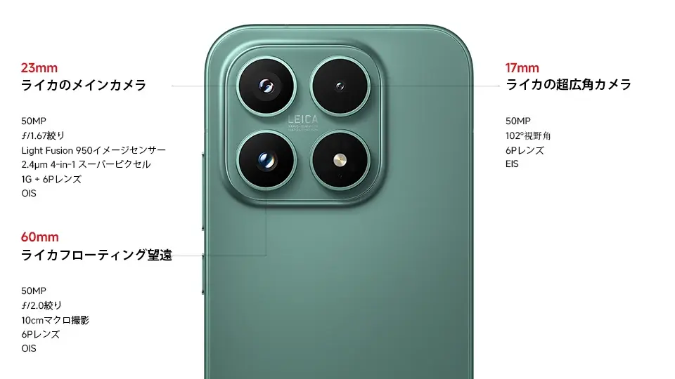 背面にはライカのレンズを冠した3つの5000万画素カメラを備えています。メインカメラは大型センサーと明るいレンズにより、光の少ない環境でも細部まで描写します。2.6倍の望遠カメラは10cmの近接撮影が可能で、102度の超広角カメラも搭載しています。