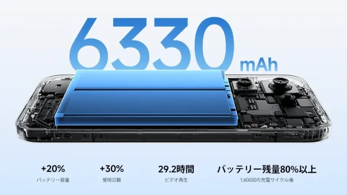 バッテリーは6330mAhの大容量を備え、有線で100W PPSの急速充電にも対応しています。また50Wワイヤレスハイパーチャージにも対応。