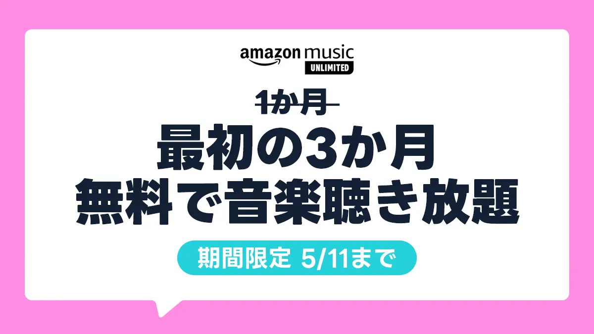 Amazonは、音楽聴き放題サービスAmazon Music Unlimitedに新規登録すると最初の3ヶ月が無料で聴き放題となるキャンペーンを開始しました。通常の無料期間は30日間ですが、キャンペーンでそれが3ヶ月に延長されます。期間は2026年5月11日まで。
