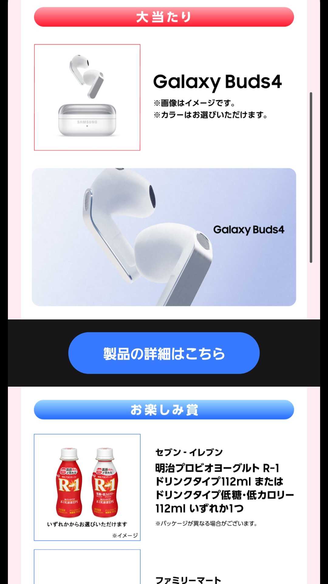 4月のGalaxyスクラッチの特賞はGalaxy Watch Ultra LTE 47mm、大当たりはGalaxy Buds4、お楽しみ賞はコンビニで引き換えられるプチギフトです。
