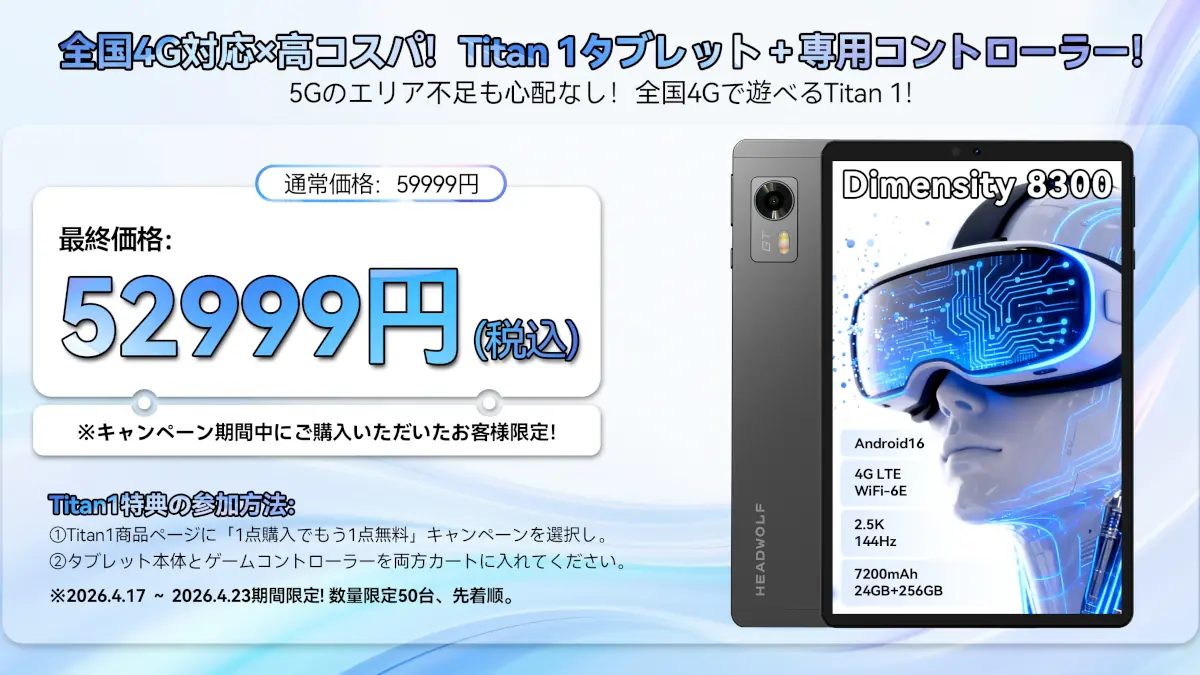Headwolfの8.8インチの軽量ゲーミングタブレット「Headwolf Titan1」が、専用コントローラーとセットで52,999円になるキャンペーンを開催中です。Amazonと楽天市場の両方で開催されており、先着50台限定です。気になる方はお早めにどうぞ。