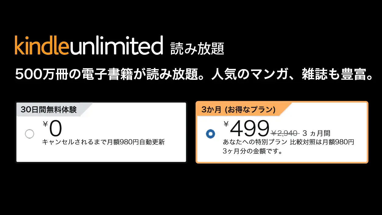 Amazonの電子書籍読み放題サービス「Kindle Unlimited」において、3ヶ月499円で利用可能となるキャンペーンが開催されています。