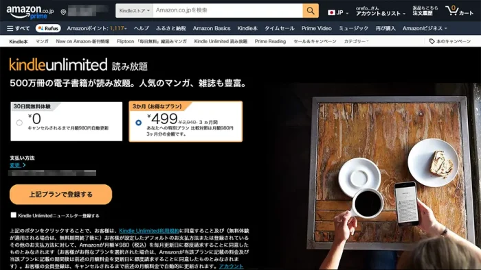 Kindle Unlimited 3ヶ月間499円で利用可能