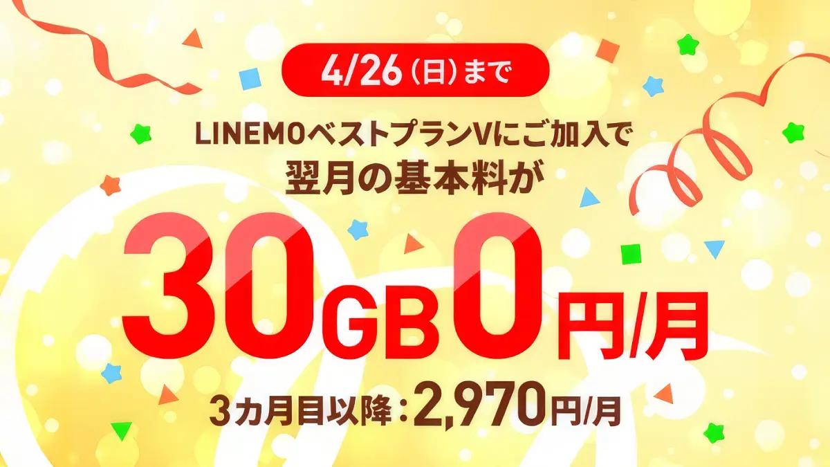 LINEMO週穫祭の2026年4月20日-4月26日は、期間中に「LINEMOベストプランV」へ申し込み、またはプラン変更すると、月額基本料が1ヶ月間0円になります。