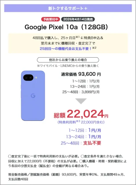 スマホ乗り換え.comでPixel 10aを購入し、MNPまたは新規(5〜18歳)で対象プランに加入、モバイルiサポに1ヶ月加入すると15,000円の現金キャッシュバックがもらえます。